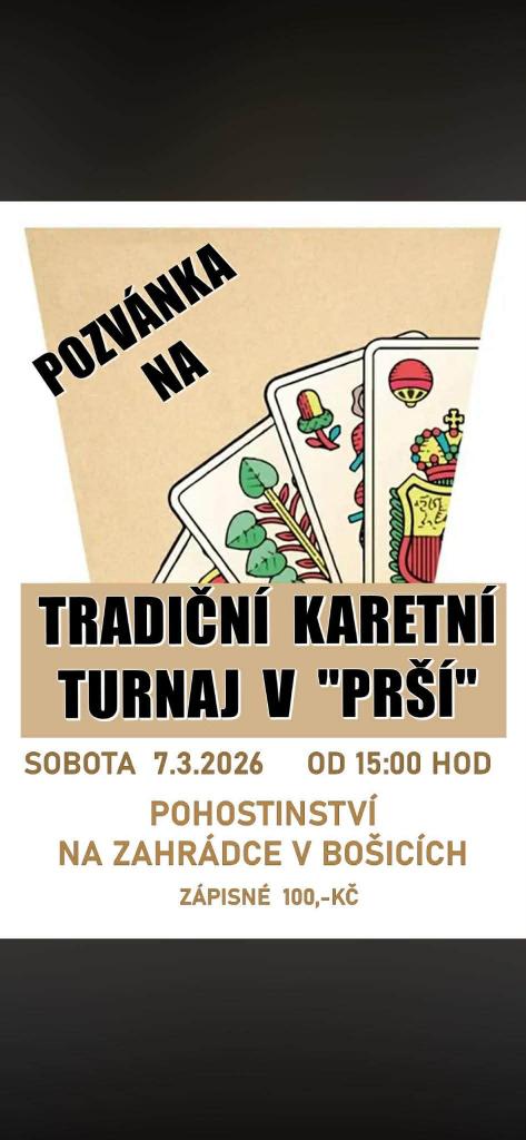 Zveme vás na tradiční turnaj v karetní hře Prší, který se uskuteční v sobotu 7. března 2026 od 15:00 hodin. Přijďte si zahrát a poměřit své dovednosti s ostatními hráči. Akce je určena pro všechny milovníky karetních her. Těšíme se na vaši účast a příjemně strávený čas. Následovat bude Country bál.